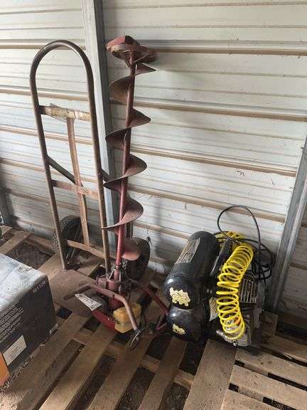 LOT 1713 - Gas ice auger, steel dolly, & electric air compressor, bldg:locked