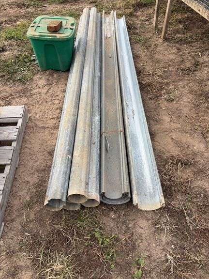 LOT 553 - (15) 10' x 6" galv. steel 1/2 round gutters, (5) 10' x 6" gal. steel corrugated down spouts, box of elbows, connectors, hangers, & downspout pipe bands, row:5